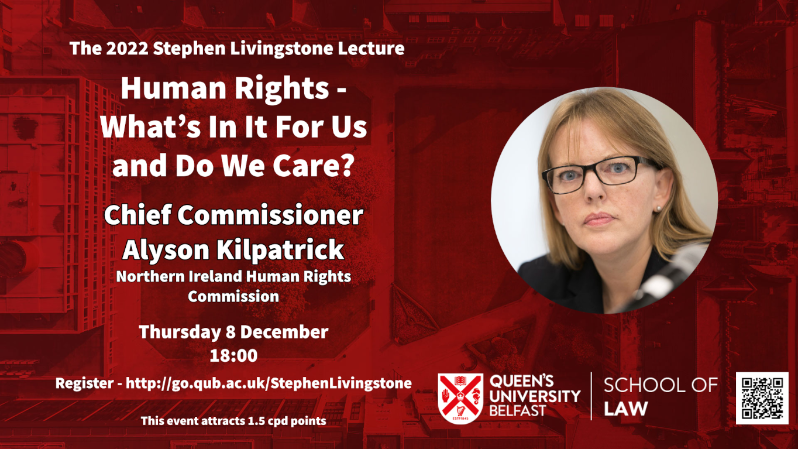 On 17 November, the School of Law at Queen’s University Belfast hosts Alyson Kilpatrick (Chief Commissioner of the Northern Ireland Human Rights Commission) in the Moot Court (MST.02.006) at 6pm.