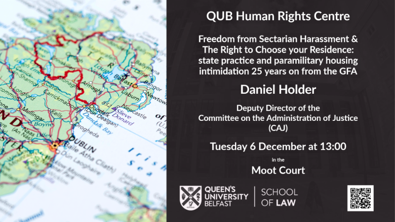 In 1998 the parties to the Good Friday Agreement affirmed rights that included rights to ‘choose your residence’ and ‘freedom from sectarian harassment’. Almost a quarter of a century on recent figures record that almost 1,400 persons have presented as homeless due to paramilitary intimidation in the last five years. Actual sectarian and racist intimidation and the broader threat of it continue to be the primary factor in shaping housing segregation and consequent inequality. Yet a 2015 UK assessment of the activities of paramilitary groups, that enumerated numerous other areas of crime attributed to elements of loyalist groups, made no reference at all to housing intimidation, nor did a consequent Stormont Action Plan for Tackling Paramilitary Activity. Official data on the source of threats has also been obfuscated and difficult to obtain, processes for dealing with intimidation tend to continue to focus on moving victims and there is a limited intervention to remove sectarian and racist expression in public space that precedes or facilities housing intimidation. This seminar will present evidence gathered by CAJ critiquing state practice in this area.