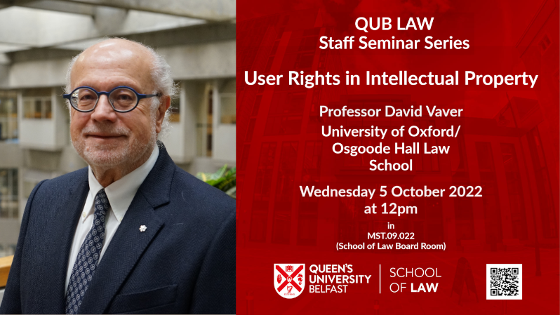 Professor Vaver's inaugural lecture Intellectual Property: The State of the Art appears at (2000) 116 LQR 621. Professor Vaver's post was established and generously funded until 2004 by the Reuters Foundation, the educational and charitable trust established by the leading international media and financial information group, Reuters. He will join QUB Law on 5th October 2022 to lead a seminar titled 'User Rights and Intellectual Property'.